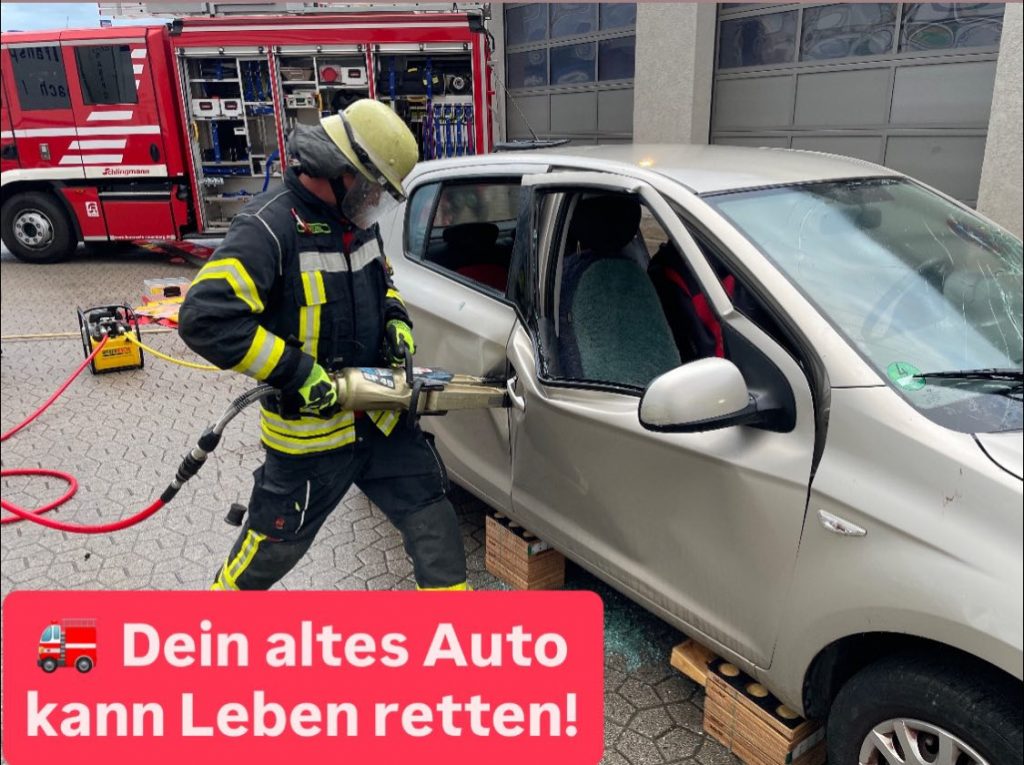 Um für den Ernstfall bestens vorbereitet zu sein, übt unsere Feuerwehr regelmäßig die technische Hilfeleistung bei Verkehrsunfällen. Dafür sind wir auf ausgemusterte Schrottautos angewiesen – nur so können wir realistische Rettungsübungen durchführen und im Einsatz wertvolle Zeit sparen.